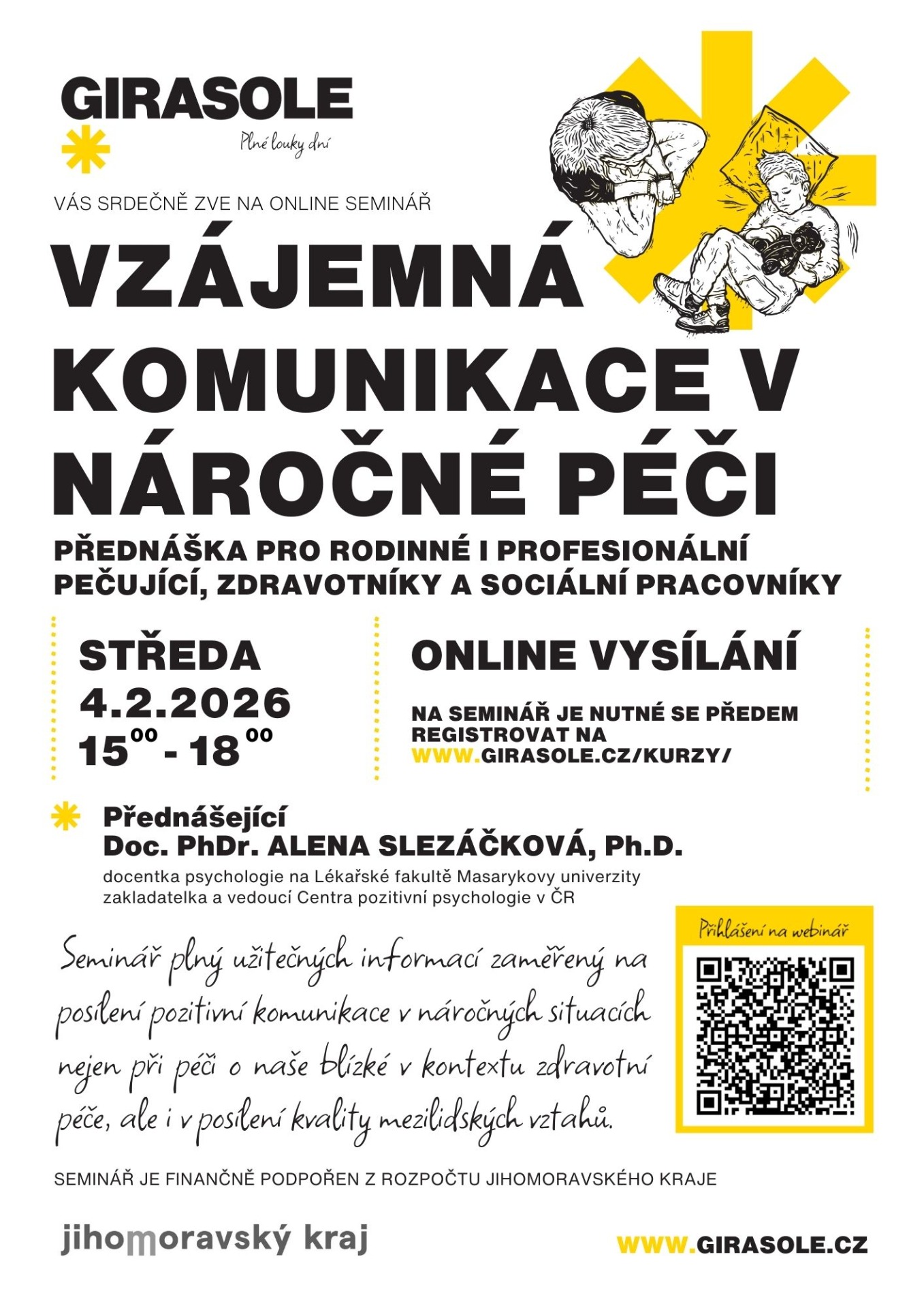 Tento webinář se zaměří na posílení pozitivní komunikace v náročných situacích. Řekneme si, jak naslouchat, hovořit spolu, sdělovat si a navzájem se oceňovat. Poradíme, jak řešit vše co je potřeba takovým způsobem, abychom si byli vzájemně oporou a povzbuzením. Přednášející doc. PhDr. Alena Slezáčková, Ph.D. stručně představí aktuální komunikační techniky. Nejen při péči o naše blízké v kontextu zdravotní péče, ale i v posílení kvality mezilidských vztahů.