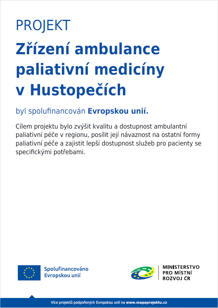 V rámci projektu podpořeného prostřednictvím Integrovaného regionálního operačního programu byla zbudována nová ambulance paliativní medicíny v prostorách Polikliniky Hustopeče na adrese Hybešova 1417/5, 693 01